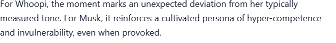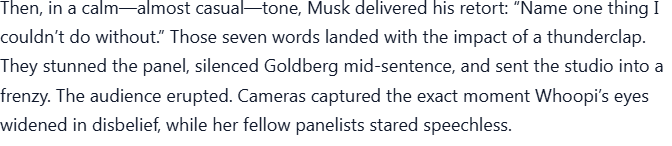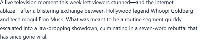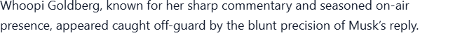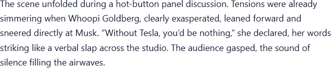 LIVE TV SHOWDOWN: During a heated segment, Whoopi Goldberg turned to Elon Musk and sneered, “Without Tesla, you’d be nothing.” The audience let out a collective gasp, the studio fell silent, and cameras caught Musk’s expression shift from amused to razor-sharp. Then, in perfect calm, he delivered 7 cutting words that not only silenced Whoopi but had the entire panel stunned — and the crowd on their feet. Social media exploded within minutes, with fans calling it “the most savage comeback of the year.”