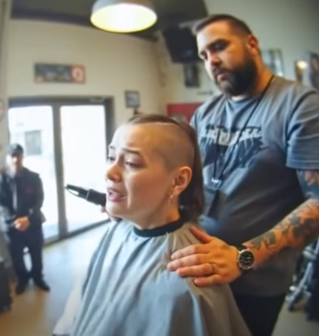 The world continued around her — the faint chatter of customers, the snip of scissors in the distance, the occasional laugh from someone at the front counter — but for her, it felt like time had slowed, narrowed down to the small space of the chair and the relentless buzz of the clippers.