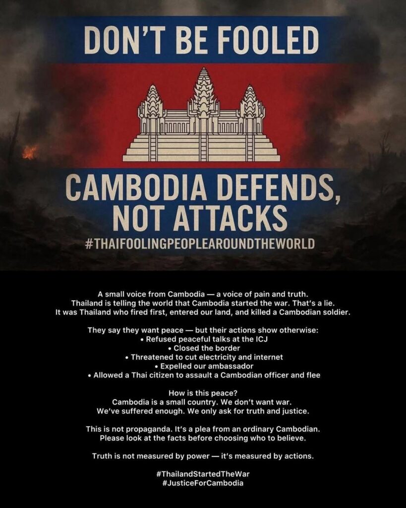 Thailand is telling the world that Cambodia started the war. That’s a lie. It was Thailand who fired first, entered our land, and killed a Cambodian soldier.